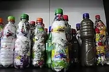 - El que está hecho con botellas recicladas de plástico Pet , en donde botellas de no más de 3L de capacidad son rellenadas con toda especie de desechos reciclables como papel , plástico que no se degrada rápidamente , empaques de aluminio , tetra pack , etc.