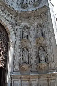 El otro arquitecto destacado en la capital fue Miguel Custodio Durán (1680-1746), un novohispano nacido en la misma, autor de los templos de San Juan de Dios (1729), del monasterio de San Lázaro y de La Regina. En San Juan de Dios desarrolla la idea del retablo fachada incorporada a un muro hornacina, coronado con una gran venera. Esta idea tenía su antecedente en San Cristóbal de Mérida del Yucatán y será seguida en otras «portadas abocinadas» en el siglo XVIII, como en la Purísima Concepción de Zumpago de la Laguna.[1]