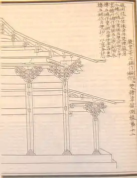 - Cimientos: La mayoría de edificios se erigían en plataformas elevadas (臺基), que funcionaban como cimientos. Podía haber vigas verticales que se apoyasen en pedestales de piedra(柱础), y estos ocasionalmente descansaban a su vez en pilastras hundidas en el suelo. En las construcciones para las clases bajas, las plataformas estaban hechas de simple tapial, no pavimentadas o pavimentadas con ladrillo o cerámica. En los casos más simples, las vigas verticales eran clavadas directamente en la tierra. Por lo que se refiere a las construcciones para las clases más altas, se solían tener altos pisos de piedra, o de tapial pavimentado con piedra, con pesados pedestales pétreos (que eran decorados) que aguantaban enormes vigas de carga.[13] Las vigas verticales se quedaban quietas en sus pedestales por la simple acción de la fricción y la presión ejercida por el edificio.[14]