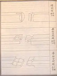 - Conexiones estructurales: Los marcos de leña se construían típicamente encajando las piezas, sin usar clavos o pegamentos. Estos tipos de juntas estructurales semirrígidas permiten a la leña resistir mejor la torsión y la flexión cuando están sometidas a alta compresión.[13] La estabilidad estructural es asegurada del todo a través del uso de vigas y techos pesados, que aplastan las estructuras.[14] La falta de clavos o pegamento y de soportes no rígidos como el antedicho dougong, sin olvidar el uso de madera como material, daba como resultado unos edificios capaces de deslizarse, flexionarse y recobrar su posición absorbiendo los golpes, las vibraciones e incluso los movimientos de un terremoto sin daños significativos para su estructura.[13]