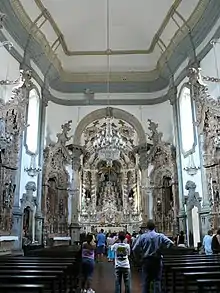 Los interiores de las iglesias coloniales deben ser vistos no sólo en términos arquitectónicos pero también decorativos, pues los ambientes internos eran muchas veces definidos por la armoniosa interacción entre talla dorada, pintura y azulejos, típica del arte portugués.[24]