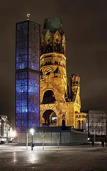* IMPERIO: temprano (1220-1250) — alto gótico (1250-1350) — tardio (1350-aprox. 1520/30). - El proyecto inicial de Eiermann se basaba en la demolición completa de las ruinas que aún quedaban en pie. Esta idea encontró una fuerte oposición por parte de de muchos ciudadanos de Berĺín, que veían esas ruinas como una reliquia del pasado. El nuevo proyecto, finalmente concretado, integra la torre semiderruída con la nueva edificación de cemento armado, desarrollada en varios bloques de planta poligonal.[39]