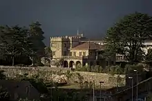 - Pazo de Montecelo.[48] Cercano a la avenida de García Barbón, en pleno casco urbano del municipio, también es conocido como Casa Durán, se trata de un pazo que data del año 1850 y que posteriormente fue rehabilitado por la familia Durán. El edificio construido en perpiaño granítico está catalogado como Bien de Interés Cultural, consta de dos alturas y en su lateral se encuentra una torre almenada, mientras que en la parte baja hay un corredor asoportado bajo arcos de medio punto, que dan lugar a una balconada en su parte superior, la cual cuenta con balaustradas de piedra.[49] La combinación de estos elementos constructivos hacen que el Pazo de Montecelo sea un ejemplo arquitectónico de combinación de estilo barroco y medieval.[50] Actualmente el pazo es sede de un bufete de abogados, siendo esta misma empresa la que recientemente contrató las últimas obras de remodelación del inmueble.