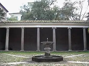 Cuando las antiguas comunidades comenzaron a construir iglesias, se basaron en una característica particular de las casas que las precedieron, el "atrio", o patio con una columnata a su alrededor. La mayoría de estos atrios han desaparecido. Un buen ejemplo permanece en la Basílica de San Clemente de Letrán en Roma y otro fue construido en el período románico en la Basílica de san Ambrosio (Milán). Los descendientes de estos atrios se pueden ver en los grandes claustros que se puede encontrar junto a muchas catedrales, y en las enormes plazas con columnas en las Basílicas de San Pedro en Roma y San Marcos en Venecia, o en el Camposanto de la Catedral de Pisa.
