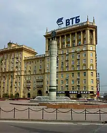 - Zemlyanoy Val, 46-48 por Yevgeny Rybitsky supera en lujo exterior, incluso para los estándares de 1949. Además de las ventanas saledizas, tiene elaborados obeliscos en la azotea, pórticos y complejas cornisas. Aún más está escondido adentro. Fue construido para los principales funcionarios de MGB, con apartamentos de 200 metros y un patio seguro de 2 niveles. La fuerza de trabajo incluía prisioneros de guerra alemanes; el cableado, la plomería y los acabados utilizados eran materiales alemanes confiscados.[24] En 1949, fue alabado, criticado en 1952,[25] y en 1955 Jruschov lo condenó por "excesos particularmente grandes".[26]
