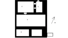 El edificio estaba dividido en cuatro habitaciones. La primera y la segunda sala eran subdivisiones desiguales del adytum (debir); la primera sala era la sala oriental, que es la más pequeña de las dos y mide 3x4 m. La segunda habitación era la habitación occidental y la mayor de las dos y medía 5x4 m.