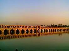 Datable de 1608, este largo puente fue construido por orden de Allahverdi Khan, el primer ministro georgiano de Abás el Grande.[17] Se dispone en continuidad con el largo bulevar Chahar Bagh.[18] Con sus arcadas, en los lados y en la base, ofrece la oportunidad de pasear en varios niveles, dependiendo de la altura del agua. Servía obviamente de lugar de franqueo del río, aunque también hacía la función de presa para regular su caudal. Al cruzarlo, el agua da lugar a un gran efecto de fuente gracias a los enmarcamientos. A su lado hay un talār, el quiosco de los espejos, desde donde el soberano podía observar el río.