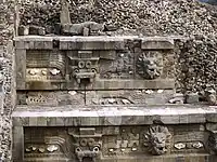 Hacia la mitad del lado este se construyó el templo conocido durante años como templo de Quetzalcoatl donde adoraban alguna deidad relacionada con el agua y la lluvia. La historiografía moderna trata de evitar esta denominación por considerarla inexacta. El edificio fue descubierto en el año 1920. Estaba soterrado por una pirámide de paredes lisas, sin ningún tipo de ornamentación.[13]