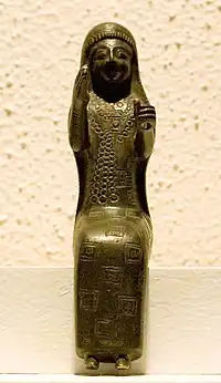 Entre estas figuritas decorativas de calderas se encuentran cabezas de toro y también deidades aladas más a menudo femeninas que masculinas. Se ha formulado la hipótesis de que estas deidades representaban al dios Shivini y a su esposa la diosa Tushpuea.[4] La técnica de fundición de piezas de bronce para calderos se originó en Urartu, en los países vecinos de Asia Menor, en particular Frigia, y es una forma de arte del Cercano Oriente que posteriormente penetró en Europa. Se han encontrado decoraciones de calderos en Grecia, Italia, Rodas, Atenas, Beocia, Delfos, Olimpia y en las tumbas de Etruria. Al principio de la investigación, muchos adornos de Urartu fueron clasificados por los investigadores como objetos antiguos en general, pero desde mediados del siglo XX, después de un examen detallado, se han clasificado como originados específicamente en el arte de Urartu.[7][8][9] Los científicos incluso han notado que las figuras de bronce de Urartu usadas en calderos habían sido usadas por otros pueblos para decorar sus barcos.