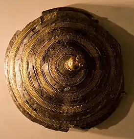 Los científicos tienen varios escudos ceremoniales de bronce a su disposición. Todos ellos estaban decorados con círculos concéntricos decorados con leones y toros. Estos escudos no estaban destinados a la lucha: el grosor de la placa de bronce y la naturaleza de los accesorios en la parte posterior indican que se utilizaban para las ofrendas (por ejemplo, en los templos), donde se colgaban en las paredes. El diámetro de estos escudos variaba de 70 cm a un metro. Las imágenes fueron estampadas en la superficie del escudo y luego despojadas con varias herramientas. La composición de las figuras está organizada de tal manera que ninguna de ellas parece estar al revés. Varios de estos escudos fueron encontrados en el raión de Van, desde donde más tarde se dirigieron al Museo Británico y a los museos de Berlín. 14 de ellos fueron descubiertos durante las excavaciones en Teishebaini en la colina de Karmir-Blour.