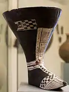 | De izquierda a derecha:ritón de arcilla pintada en forma de bota. Descubierto durante las excavaciones en Karmir Blur. Conservado en el Museo de Historia de Armenia; ritón en forma de cuello de animal. Descubierto en el raión de Van. Conservado en el Museo Arqueológico de Estambul; Vaso ritual decorado con cabezas de toro. Descubierto durante las excavaciones de los enterramientos del periodo Urartu en el territorio de Armenia. Conservado en el Museo Erebuni.[17] | ||||