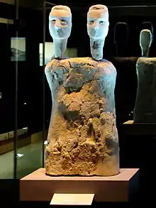 Ya en el período neolítico en Jordania, se hacían figurillas y esculturas. En algunos de los primeros ejemplos, los cráneos humanos se construyeron con yeso, y se utilizaron incrustaciones para las cuencas de los ojos.[8] Dos escondites de figurillas descubiertas en Aïn Ghazal, cerca de Amán, incluyen modelos animales y unas tres docenas de figurillas monumentales (ilustradas abajo), que los estudiosos consideran importantes para el ritual y la estructura social de los pueblos que vivieron allí,[9] y pueden haber formado parte de un ritual de entierro.[10] Las estatuas de Ain Ghazal son muy grandes, con una altura de alrededor de un metro. Aïn Ghazal fue ocupada entre el 7000 y 5000 a. C. y las estatuas se han fechado alrededor de 6500 a. C..[11][12] Las estatuas, que muestran un amplio uso del yeso, representan una clara desviación de las diminutas figuras sin rostro del Paleolítico y marcan el comienzo de un arte neolítico distinto.[11]