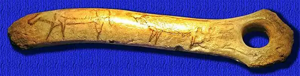- Durante el Paleolítico medio (200 000-35 000 a. C.), Europa occidental y las costas del Mediterráneo estaban habitadas por el hombre de Neanderthal. Esta especie humana ya había desarrollado formas lingüísticas simbólicas rudimentarias, así como creencias religiosas y, probablemente, las primeras formas de arte: en efecto, las excavaciones demuestran que coleccionaba objetos curiosos (fósiles, minerales cristalizados), que elaboraba cierto tipo de adornos; muy conocidos son los huesos perforados, como los de Lunel-Viel y Port-Launay (Francia) y el más antiguo de la Cueva de Las Grajas (Archidona, Málaga[5]), que podría emplazarse en la glaciación de Riss, datado en unos 200 000 años. También en Francia, en Pech de l'Aze, apareció una costilla de bóvido grabada datable en el interglaciar Mindel-Riss. Fuera del ámbito europeo, es muy destacable el hallazgo de dos placas de ocre con grabados abstractos pero intencionales, con una pauta geométrica concreta (reticulado) en la caverna de Blombos (República Sudafricana), cuya edad podría ser de unos 70 000 años (Edad Media de la Piedra africana). Este hallazgo está relacionado con otros bloques de ocre que, según se ha probado, se usaba como un pigmento de adorno corporal (todos estos hallazgos proceden tanto de lugares de habitación, como de auténticas inhumaciones rituales); sin embargo, es la primera vez que esta especie de lápices de ocre conservan algún tipo de decoración. Además, en la caverna de Blombos hay numerosos adornos de conchas perforadas (aunque este dato es bastante controvertido, por el momento).