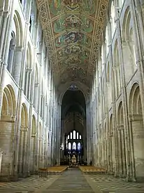 Nave de la catedral de Peterborough (a partir de 1118), con uno de los tres techos de madera original que se conservan en Europa.