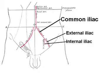![]() La arteria ilíaca externa es la arteria grande en el centro, el ligamento inguinal se extiende desde la parte superior derecha de abajo a la izquierda. Cuando la arteria cruza el ligamento, se convierte en la arteria femoral. | ||