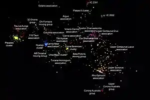 - Asociación estelar T: Compuestas de jóvenes estrellas del tipo T Tauri. Estas asociaciones normalmente se encuentran cerca de la nube molecular desde la que se han formado. Los grupos estelares jóvenes pueden contener un número de estrellas T Tauri infantes que aún están en proceso de entrar en la secuencia principal. Estas poblaciones dispersas de hasta mil estrellas T Tauri se conocen como asociaciones T. El ejemplo más cercano es la asociación Tauro-Auriga T (asociación Tau-Aur T), situada a una distancia de 140 parsecs del Sol.[6] Otros ejemplos de asociaciones T incluyen la asociación T R Corona Australis, la asociación T Lupus, la asociación T Chamaeleon y la asociación T Velorum. Las asociaciones T suelen encontrarse en las proximidades de la nube molecular de la que se formaron. Algunas, pero no todas, incluyen estrellas de clase O-B. Para resumir las características de los miembros de los grupos en movimiento: tienen la misma edad y origen, la misma composición química y presentan la misma amplitud y dirección en su vector de velocidad.