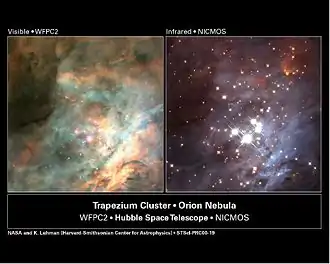 - Asociación estelar R: Las asociaciones de estrellas que iluminan las nebulosas de reflexión se denominan asociaciones R, un nombre sugerido por Sidney van den Bergh tras descubrir que las estrellas de estas nebulosas tenían una distribución no uniforme.[7] Estas jóvenes agrupaciones estelares contienen estrellas de la secuencia principal que no son lo suficientemente masivas como para dispersar las nubes interestelares en las que se formaron.[8] Esto permite a los astrónomos examinar las propiedades de la nube oscura circundante. Dado que las asociaciones R son más abundantes que las asociaciones OB, pueden utilizarse para trazar la estructura de los brazos espirales galácticos.[9] Un ejemplo de asociación R es Monoceros R2, situado a 830 ± 50 parsecs del Sol.[8]