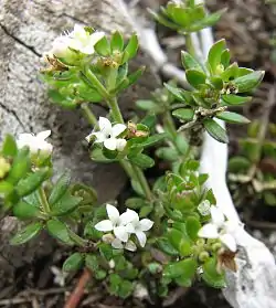 Es una hierba perenne ascendente o decumbente, con tallos que alcanzan un tamaño de 20 cm de largo, ± bien ramificados, las crestas visibles, ± escabrosas con pelos cortos, recurvados, entrenudos de 0,5-3 cm de largo. Las hojas y estípulas en verticilos de 5 o 6, rara vez 4 en el ápice, obovadas u oblanceoladas a elípticas, la mayoría de 4-8 mm de largo, 2,5 mm de ancho, el ápice agudo. Las flores en cimas axilares o terminales, con 2 o 3 flores. La corola blanca. Las flores masculinas de 3 mm de largo; las flores femeninas de 2 mm de largo. El fruto 1-2 mm de largo, negro.[1]