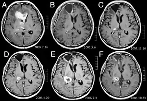 ![]() (A) La imagen de RM muestra un tumor en los lóbulos frontales derecho y izquierdo, así como en el tálamo derecho. (B) RM después del tratamiento con resección quirúrgica, radioterapia y quimioterapia. El tumor ha desaparecido por completo, excepto por un ligero realce adyacente al margen quirúrgico. (C) Recurrencia del tumor talámico 9 meses después, a pesar de la quimioterapia de mantenimiento. (D) Crecimiento del tumor talámico dos meses después de la radioterapia estereotáxica. (E) Después de 6 ciclos de quimioterapia con temozolomida, la lesión talámica ha aumentado y el paciente presenta disartria y hemiparesia. (F) Después de 2 ciclos de tratamiento con interferón-beta y temozolomida, el tumor muestra una regresión parcial. | ||