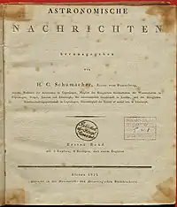 La revista fue fundada en 1821 por Heinrich Christian Schumacher,[8] bajo el patrocinio de Cristián VIII de Dinamarca. Schumacher editó la publicación desde su observatorio en Altona. Schumacher editó los primeros 31 números de la revista desde su fundación, hasta su muerte en 1850.[9] Los primeros ejemplares consistían mayormente en cartas enviadas por astrónomos a Schumacher contando sus observaciones[10]
