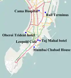 | Edificio Nariman House. Casa de Jabad en Bombay. | Asedio, tiroteo,[30] y toma de rehenes. Edificio utilizado como centro social y cultural por la organización jasídica Jabad-Lubavitch.[31] |