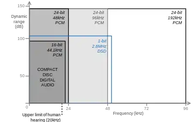 Incluso se encuentran grabaciones de 44.1 kHz/24 bits, 48 kHz/24 bits y 88.2 kHz/24 bits consideradas como audio HD. La investigación en este campo se inició en los años 80 y desde 1996, el contenido de audio de alta resolución se ha vuelto accesible en el mercado de consumo.[2]