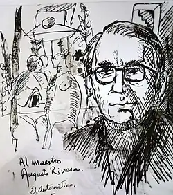 ![]() Augusto Rivera Garcés. Dibujo a tinta de Fabio Barrera Las figuras del fondo se basan en dibujos del maestro Rivera. | ||
