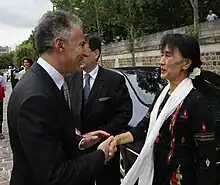 Aung San Suu Kyi (en birmano, အောင်ဆန်းစုကြည် /àuɴ sʰáɴ sṵ tɕì/; Rangún, 19 de junio de 1945) es una política birmana. El 30 de marzo de 2016, asumió los ministerios de Exteriores, Energía, Educación y la Oficina de la Presidencia. No pudo asumir la Presidencia del Gobierno a pesar de que el partido que lidera, Liga Nacional para la Democracia (LND), ganó las elecciones celebradas en noviembre de 2015, puesto que la Constitución birmana prohíbe ocupar el puesto a quienes tengan hijos con pasaporte extranjero y los de Suu Kyi tienen nacionalidad británica. Finalmente, el Parlamento —en el que el LND tiene mayoría absoluta— eligió como presidente de Birmania a Htin Kyaw, amigo íntimo de Suu Kyi y con cuatro de los ministerios más importantes del gobierno; Aung San Suu Kyi pasaría a gobernar en la sombra.[1]