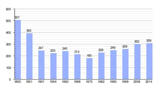Los datos demográficos contemplados en este gráfico de la comuna de Auquainville[4] se han cogido de 1800 a 1999 de la página francesa EHESS/Cassini, y los demás datos de la página del INSEE.[5]