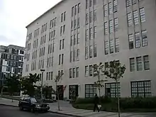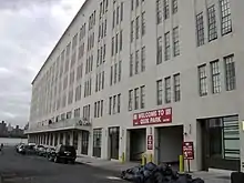 La fachada de hormigón armado es relativamente simple y está pintada en tonos de blanco.[18][51] Está dividida en numerosos tramos arquitectónicos, que generalmente contienen grupos de tres ventanas estrechas y ligeramente empotradas en cada piso.[50] La fachada occidental está dividida en ocho tramos, cada uno con tres ventanas en cada piso, excepto el tramo más al sur, que solo contiene dos. La fachada este se divide en nueve tramos; las sitiadas más al norte y más al sur contienen 2 ventanas, mientras que las siete restante, tres. Se puede encontrar un patrón similar en las fachadas norte y sur más largas, donde la mayoría de los tramos tienen tres ventanas, mientras que los tramos finales y dos de los centrales tienen dos. Los muelles de carga, ahora sellados, se ubicaron en las fachadas oeste, norte y sur.