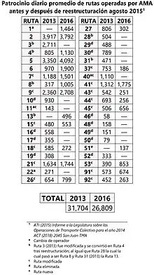 Paralelo a la discusión y aprobación del proyecto que creó a la ATI, en agosto de 2014 la AMA propuso la eliminación de veintitrés rutas de las treinta y siete que eran ofrecidas directamente por dicha corporación pública. El plan de reestructuración consistía en delegar la operación de las rutas eliminadas a los municipios y porteadores públicos con el propósito de lograr economías y un mejor servicio en las rutas con mayor demanda. Este plan de reestructuración sufrió cambios y fue implantado en tres fases; las primeras dos durante el mes de agosto de 2015 y la tercera en marzo de 2016.[41] El resultado final fue la modificación de veintiún rutas, la eliminación de quince rutas ofrecidas directamente por la AMA y el aumento en la cantidad de rutas ofrecidas por la empresa First Transit; de cuatro rutas a siete. Además, el horario de servicio fue reducido y el servicio dominical fue limitado a solo dos rutas. Este plan también incorporó a los porteadores públicos en el ofrecimiento de los servicios a través de incentivos económicos otorgados por la ATI para complementar el servicio en cinco rutas de baja frecuencia.[42]