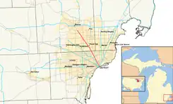 - Michigan Department of Transportation (2001). Michigan, Great Lakes Great Times: Official Department of Transportation Map (Map). c. 1:158,400. Lansing: Michigan Department of Transportation. Detroit and Vicinity inset. OCLC 42778335. Retrieved October 17, 2019 – via Michigan History Center.