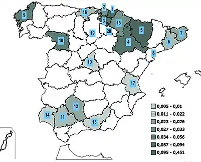 - Castilla y León: Zamora (18) 6; Burgos (19) 5