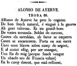 - Alonso de Ayerbe y Nicolás de Ayerbe son dos personajes que se citan en las "Trovas de Mosen Jaime Febrer que tratan de los conquistadores de Valencia", escritas en verso y en lengua valenciana, se atribuyen a un supuesto autor de finales del siglo XIII llamado Jaume Febrer, aunque hoy se considera que es una obra apócrifa elaborada por un tal Onofre Esquerdo en 1670. En dichas trovas se afirma que ambos caballeros participaron valerosamente en la conquista de Valencia, indicando que Alonso era oriundo de la villa de Ayerbe, y que Nicolás era de origen navarro, y se describen sus correspondientes escudos heráldicos. Aun asumiendo que fueran personajes ficticios, estas trovas reflejan la evidencia documental de la época que confirma la participación de personas con apellido Ayerbe en la conquista de Valencia.