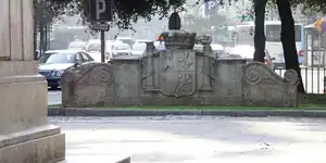 Justo en frente de la estatua ecuestre de Franco, estaba situado el escudo de la II República Española. Se procedió a la retirada de ambos símbolos el 18 de diciembre de 2008. Siendo de esta manera la última estatua de Franco retirada de un espacio público municipal. Tras su retirada, la estatua de Franco se trasladó al almacén municipal.[2]