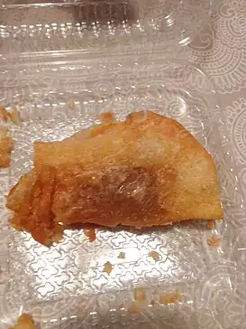 El dulce recibió el mismo nombre que un pez, también común en la región, por tener una forma igualmente plana y alargada.[4] La masa es rellena de calabaza o camote y se fríe en aceite, luego se espolvorea con azúcar y canela.[5] El relleno puede ser un legado de las tragemas romanas, según informa Apício.[6]