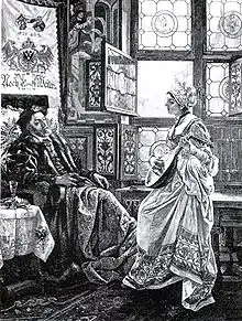 ![]() Carlos I de España con Bárbara Blomberg. Grabado en madera de 1894. | ||