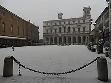 En la parte baja se engloba la mayor parte de la población encuentran edificaciones más modernas y los edificios públicos más importantes como el Ayuntamiento, la sede del gobierno provincial o el conjunto Piacentiniano.