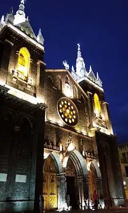 - Santuario de la Virgen de Agua Santa: Es la iglesia principal de la ciudad y uno de los principales centros de peregrinación católica del país. Fue construida entre el 11 de febrero de 1904 y 1944. Está ubicada en la calle Ambato entre 16 de diciembre y 12 de noviembre, frente al Parque Sebastián Acosta. Es de estilo seudo-gótico, de forma rectangular con grandes columnas y con arcos ojivales y dividida en 3 naves. Toda la decoración y los lienzos que lo adornan fueron hechos por el Fray Enrique Mideros, en donde se narran en su mayoría los numerosos milagros de la Virgen de Agua Santa, Patrona de la Ciudad. En todo el mes de octubre se celebren las fiestas en honor a la Virgen, con peregrinaciones, procesiones, bailes, etc.[18]