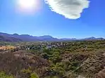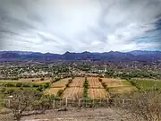 Una fotografía panorámica del pueblo, El pueblo desde las montañas, el templo San Ignacio de Loyola junto al Museo Estatal del Bacanora y al final el Monumento a la elaboración Bacanora.