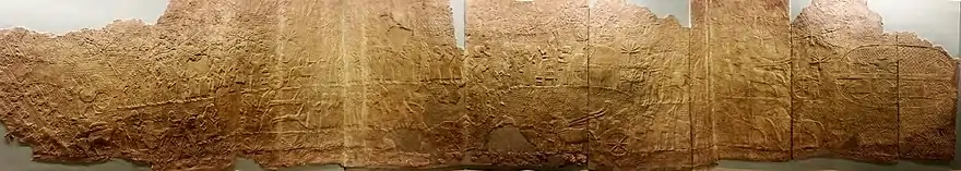 El relieve, que consta de doce paneles, muestra la conquista de la ciudad judía de Laquis en el 701 a. C. en una escena narrativa coherente. La narración comienza a la izquierda de la entrada de la habitación 305 con una representación de la invasión del ejército asirio (I y II). En el centro del relieve (II-IV) se representa el asalto a la ciudad, por cuyas puertas (posteriormente) la gente huye y es capturada. El área adyacente muestra a los judíos deportados (IV–VI). En la pared lateral derecha (VII) se puede ver al rey Senaquerib, pero los medos o babilonios le arañaron la cara cuando conquistaron Nínive. Luego se puede ver la tienda real y los carros reales (IX y X). La conclusión (XI y XII) fue la representación de un campamento militar en el lado derecho de la entrada.[8]
