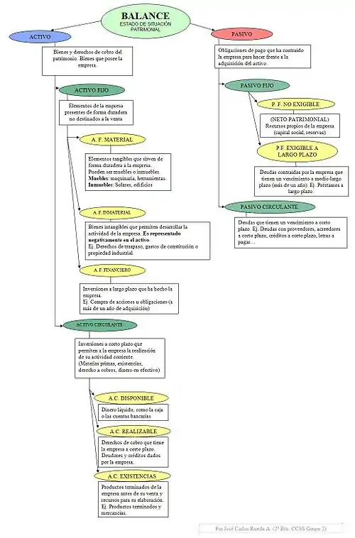 En el balance general, el total de activos debe ser igual que el pasivo más el capital, porque los dos totales implican dos aspectos de un conjunto de recursos[3] La ecuación contable sirve para expresar esta relación de la siguiente manera: