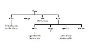 - Banu Ka'b: esta rama era la más grande y estaba dividida en cuatro tribus: Uqaylí, Banu Ja'dah, Banu Qushayr y Al Harish. Todas eran nativas de al-Yamama, particularmente del sur de esta región, e incluían tanto a pastores beduinos como a agricultores asentados. De las cuatro la Uqaylí era, con diferencia, la más grande y poderosa. Tras partir hacia el norte de Irak a finales de la era abasí, los beduinos establecieron la dinastía Uqáylida en Mosul (siglo V islámico). Posteriormente, sectores de la tribu regresaron a Arabia, instalándose en la provincia de Bahrein, donde dieron origen a las dinastías Usfurid y Jabrid. Varios grupos tribales de Irak se originaron a partir de los Uqaylí, incluidos los Tutub, Ubadah y al-Muntafiq. Otras ramas de la tribu Kaab abandonaron las regiones de al-Yamama y Néyed en fecha posterior y se establecieron a ambos lados del Golfo Pérsico. Ahora se les conoce como Bani Ka'b y en su mayoría viven en la región de Ahvaz en Irán, Emiratos Árabes Unidos e Irak.