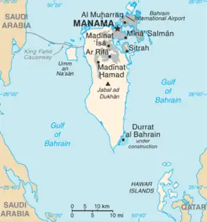 Baréin,[1] cuyo nombre oficial es Reino de Baréin[6] (en árabe: مملكة البحرين, Mamlakat al-Baḥrayn), es un micro-Estado soberano insular asiático situado en la costa oeste del golfo Pérsico, cuya forma de gobierno es la monarquía constitucional. Su territorio está organizado en cinco gobernaciones y su capital es la ciudad de Manama. En el sitio oficial en español de la ONU aparece mencionado como «Baréin».[7]