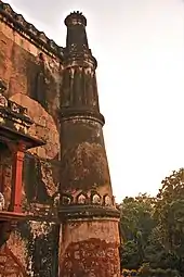 La mezquita a su vez tiene 20 m de lado y las esquinas de la trasera y los laterales cuentan con altos minaretes de planta semicircular y alzado cónico.[8] El este, el sur y el oeste están decorados, y disponen de aberturas de arco de ogee, que se colocan en marcos rectangulares. La estructura combina vigas de soporte y dintel, aunando características de las arquitecturas islámicas e hindú.[2][3][8] La cúpula, la mezquita y el mehman khana están construidos con piedra de color rojo, gris y negro, incluida cuarcita gris y piedra arenisca roja. El interior está ornamentado con elaborados estucos pintados. Hay azulejos de colores, tallas incisas y yesos pintados decorados con follaje, flores, patrones geométricos e inscripciones coránicas.[2][3][8]