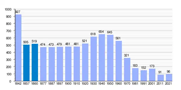 | Gráfica de evolución demográfica de Barchín del Hoyo[6] entre 1842 y 2021 |