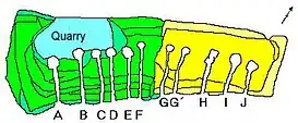 Una de las tumbas, la H, presenta una arquitectura más trabajada que el resto, con una antesala abovedada precediendo a la cámara y separada de ésta por dos pilares que muestran grabados de hachas y arcos.
