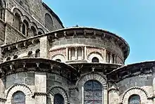 La basílica de Nuestra Señora de Orcival presenta una destacada cabecera románica auvernesa constituida por una escalonamiento de volúmenes de altura creciente: