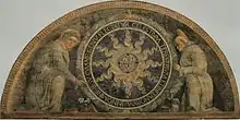 Tímpano de la puerta , con la obra que sustituye al original de Mantegna