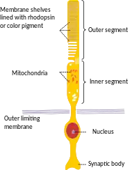 Los bastones son más delgados que los conos, el diámetro de sus segmentos internos es de aproximadamente 2 micras. Los segmentos externos de los bastones están formados por discos membranosos aislados de la membrana plasmática, donde se encuentra la rodopsina. Estos discos están continuamente renovándose. Los discos antiguos se van desplazando hacia la zona del epitelio pigmentario, donde son fagocitados y convertidos en fagosomas durante el ciclo diurno, sobre todo al amanecer.